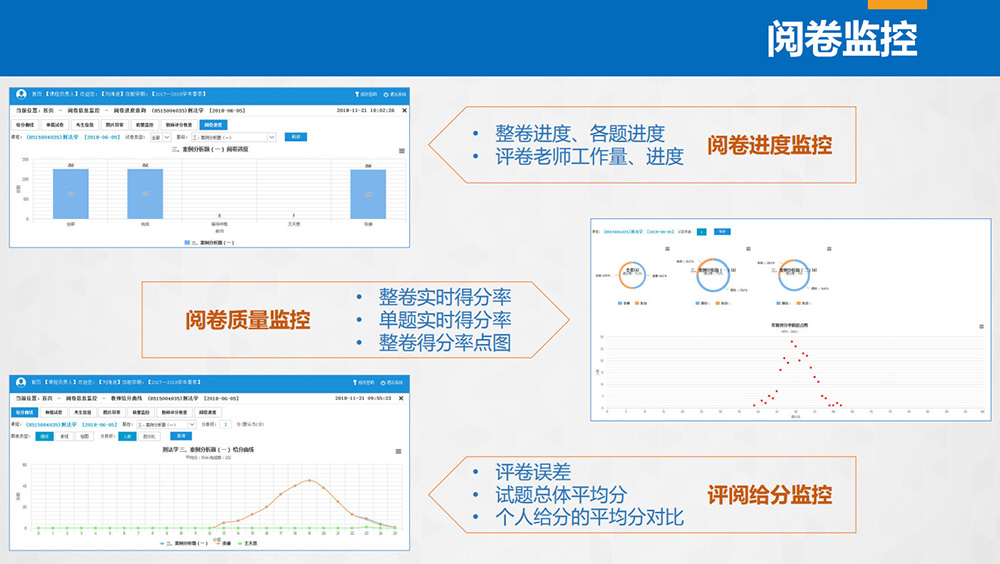 1. 閱卷進度監(jiān)控: 顯示試題數(shù)、閱卷教師信息、全部和個人閱卷任務(wù)數(shù)、已閱份數(shù)、未閱份數(shù)、仲裁份數(shù);顯示整卷進度、各題進度、評卷教師工作量及進度;